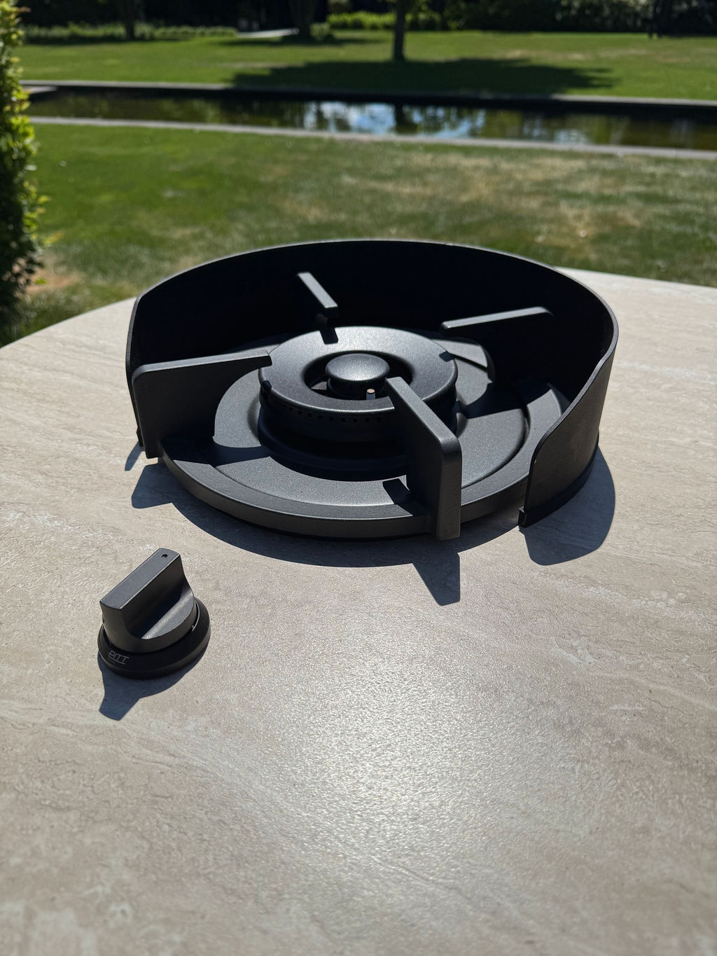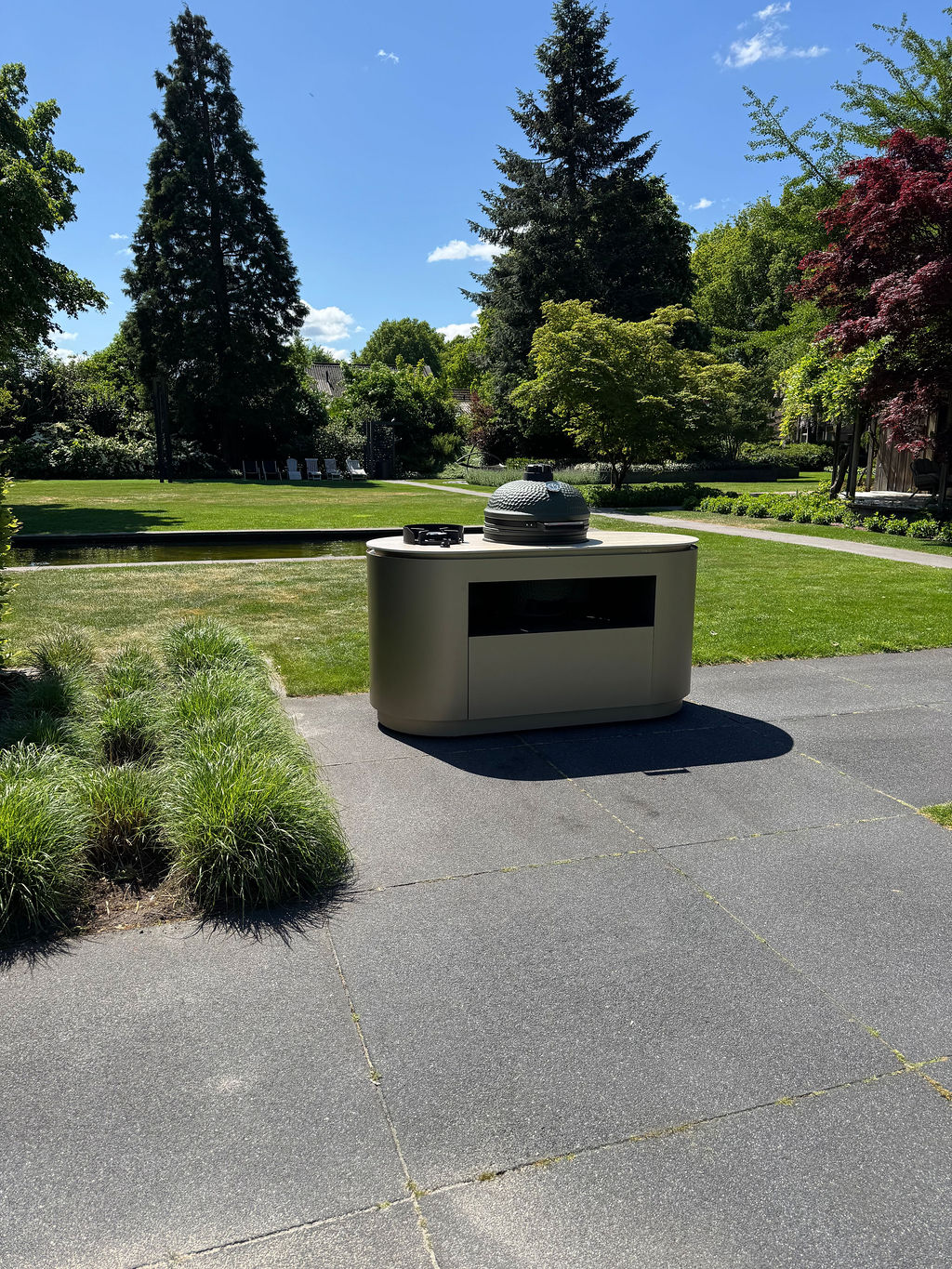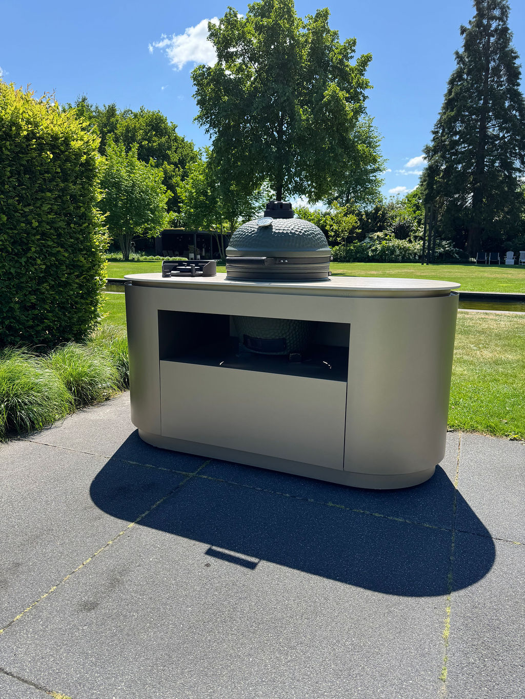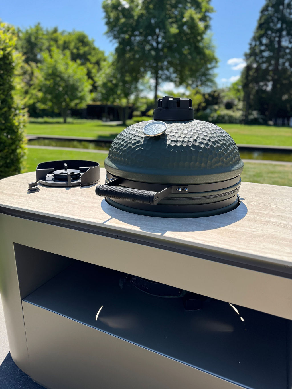 Deze buitenkeuken is niet alleen een lust voor het oog, maar ook een toonbeeld van functionaliteit. Uitgerust met een Moddern kamado om op te grillen, een 1-pits Pitt Cooking om bijvoorbeeld saus op te warmen en een handige lade voor opbergspullen, biedt deze keuken alles wat je nodig hebt voor het ultieme buitenkoken. Wat deze buitenkeuken écht uniek maakt? Hij is verrijdbaar en daardoor op elke gewenste plek in de tuin neer te zetten. Flexibiliteit en stijl in één indrukwekkend design.